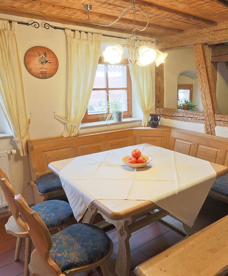 Unsere Bauernglück verbindet traditionellen Charme mit modernem Komfort. In allen Räumen sind die alten, handgehauenen Balken sichtbar, die der Wohnung ihre besondere Atmosphäre verleihen.